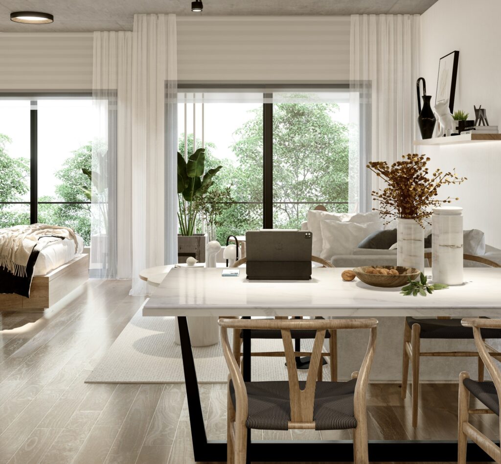 La relación directa con el balcón y el exterior suma aire, luz y continuidad visual, ampliando la experiencia cotidiana y reforzando una forma de vivir más cómoda, luminosa y adaptable.