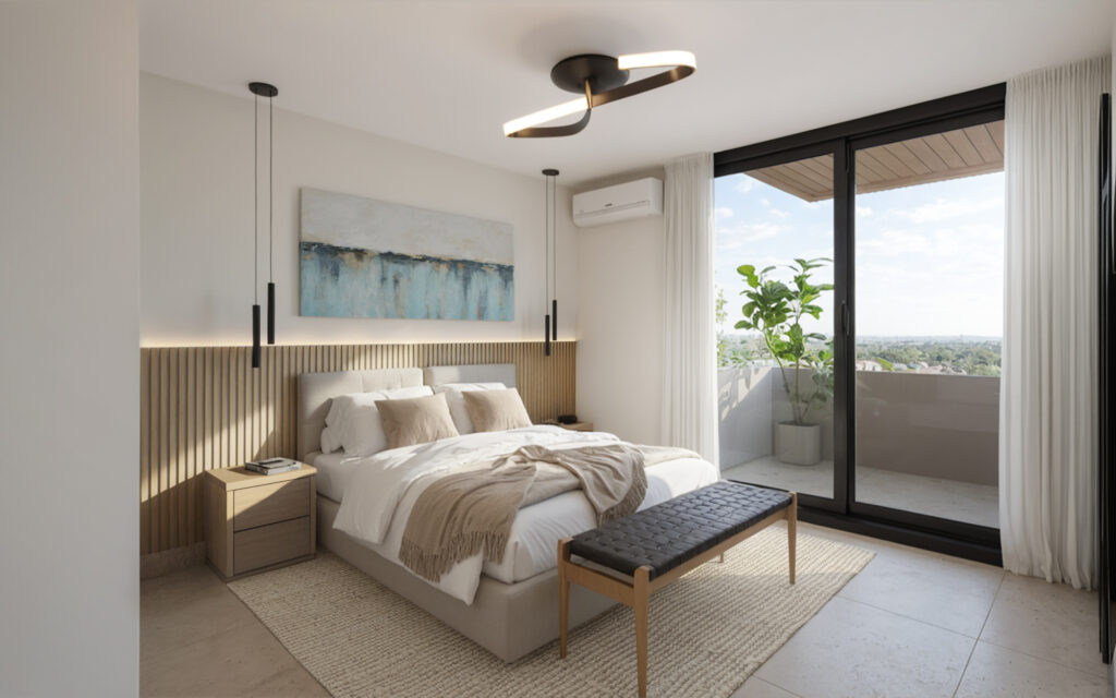✅ Amplitud y luminosidad: grandes ventanales que integran el dormitorio con el balcón y las vistas verdes.